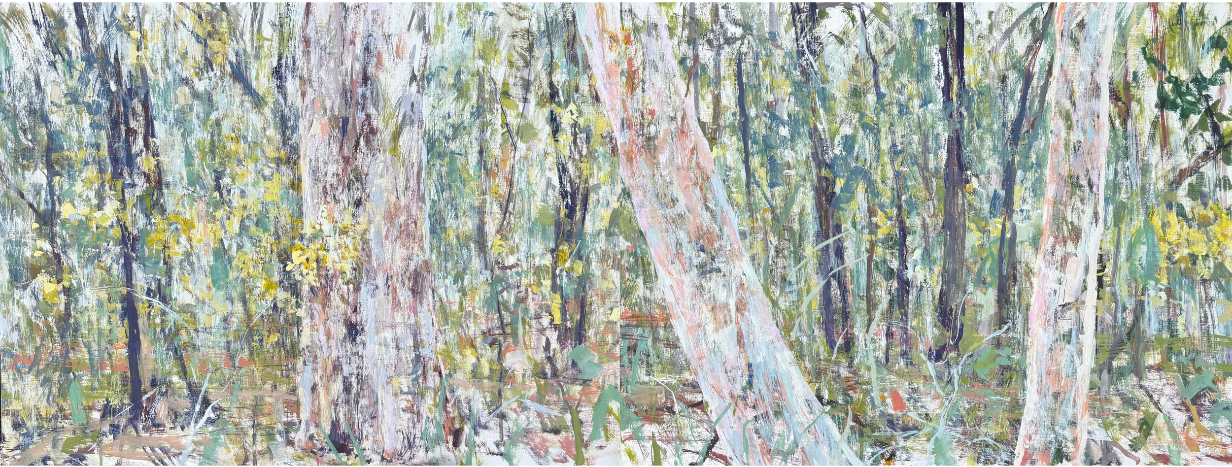 Unknowing presents a new body of work inspired by Larkin’s time on residency at Eramboo, which she was awarded through the Paddington Art Prize 2024. Larkin’s residency in August 2025 coincided with two weeks of torrential rain. Leaping at brief windows between showers (or on the rare clear day), many of these paintings were created amongst the eucalypts, wildflowers and squawking black cockatoos of Ku-ring-Gai National Park, which surrounds the gallery at Eramboo and whose presence was so intrinsic to the creation of this body of work.